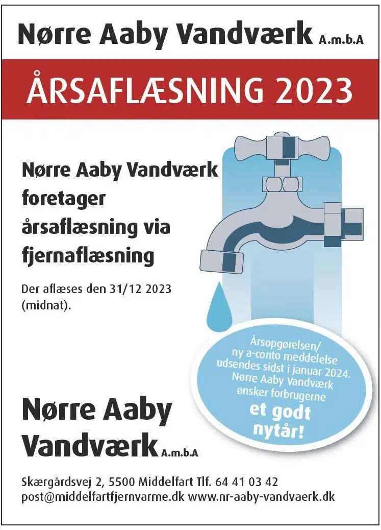Nørre Aaby Vandværk foretager årsaflæsning via fjernaflæsning 31/12 2023.